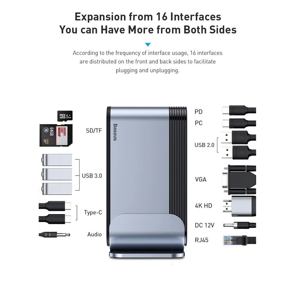 - Với Hub chuyển đa năng Baseus Working Station 16 in 1 Multifunctional bạn có thể dễ dàng xuất hình ảnh, âm thanh độ nết cao qua cổng HDMI/ VGA/ AUX 3.5mm , đồng bộ và chia sẽ dữ liệu/ hình ảnh từ thẻ nhớ, các thiết bị lưu trữ. Ngoài ra bộ HUB còn được trang bị cổng mạng LAN có dây (RJ-45) cho phép bạn có thể kết nối mạng ở những nơi không có Wifi . Bạn sẽ không còn phải gặp các phiền phức và bất tiện do thiếu cổng kết nối.
