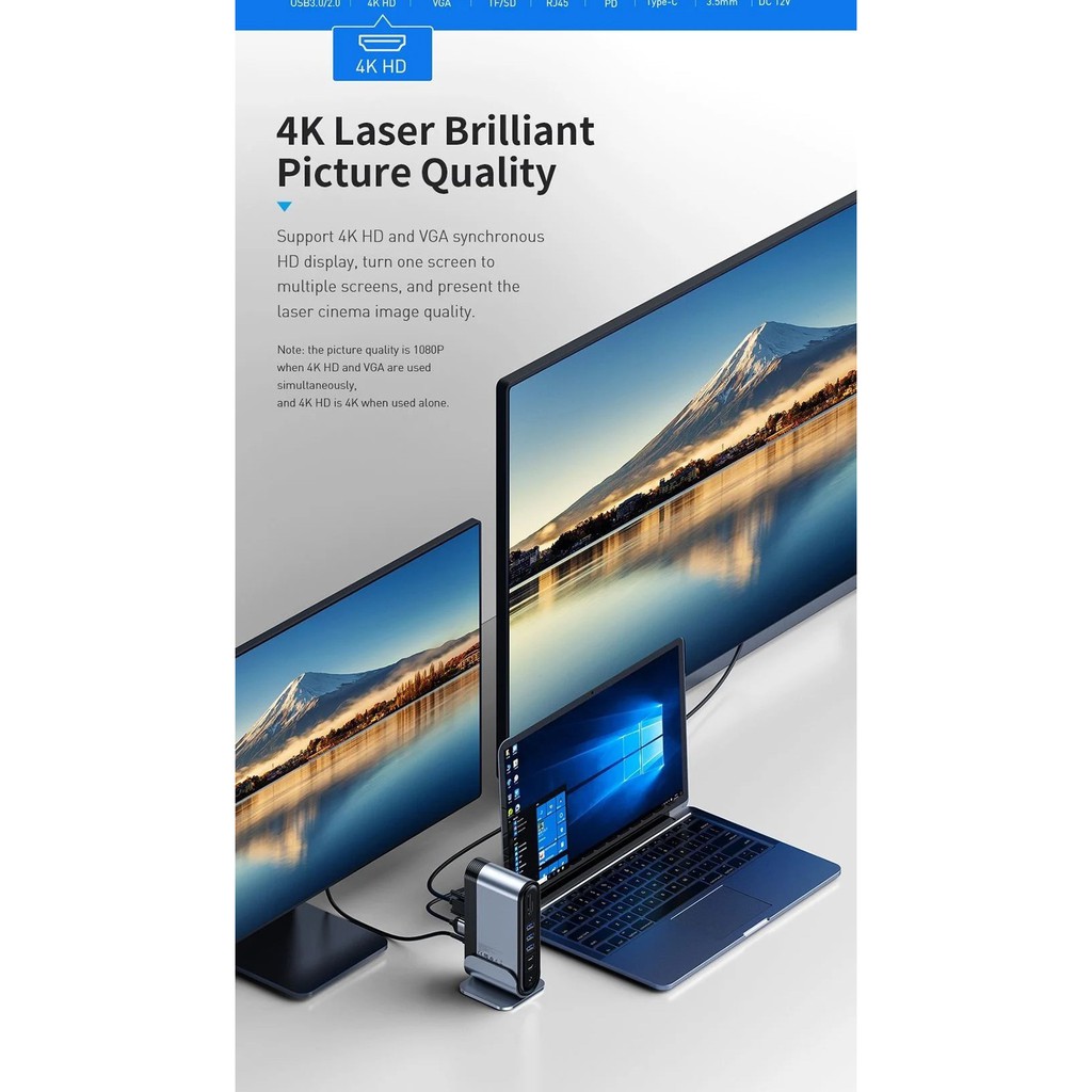 - Sản phẩm được trang bị cổng HDMI và VGA hỗ trợ 4K ở ngỏ ra cho phép bạn xuất hình ảnh từ Laptop ra 2 màn hình lớn khác nhau ở cả 2 chế độ song song hoặc mở rộng (chia/ghép màn hình) .