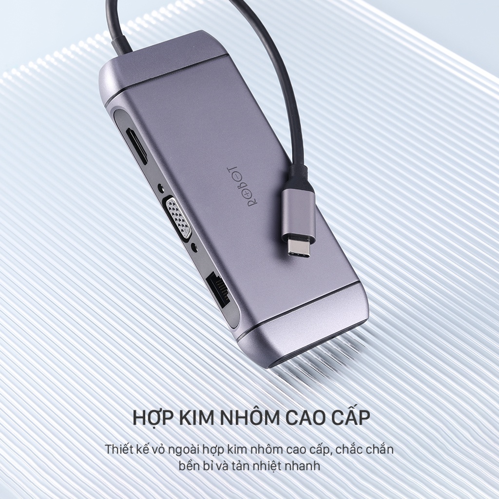 HUB CHUYỂN ĐỔI 9 TRONG 1 ROBOT HT490 TỪ CỔNG TYPE-C SANG CỔNG USB 3.0/ USB 2.0/ Type-C/ HDMI/ SD/ MicroSD/ VGA/ LANs - HỖ TRỢ CHẤT LƯỢNG HÌNH ẢNH ULTRA HD 4K VÀ SẠC NHANH CHUẨN PDSản phẩm chính hãng ROBOT