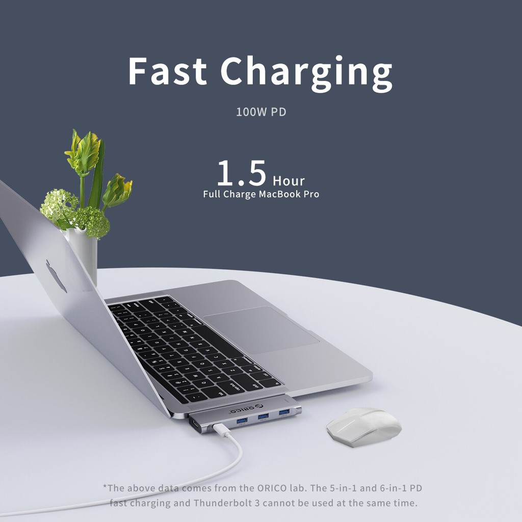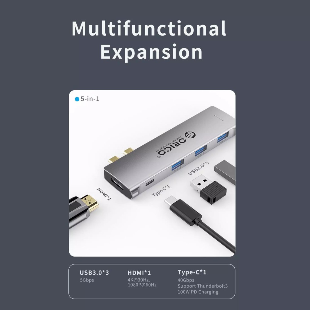 Máy tính & Laptop > Phụ Kiện Máy Tính > Bộ chia cổng USB & Đọc thẻ nhớ || Bộ Hub chuyển đổi chia cổng 5 trong 1 Orico USB type C kép sang HDMI USB 3.0 dành cho Macbook ProCòn hàng