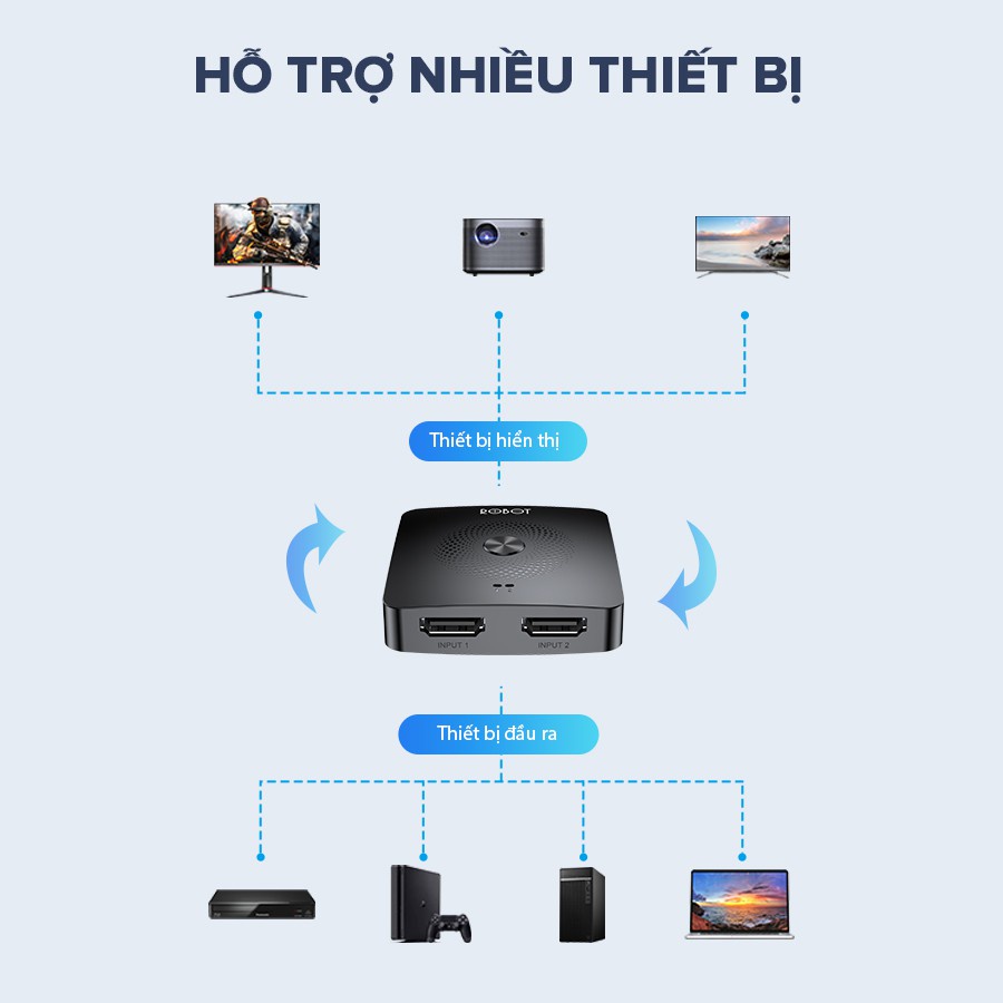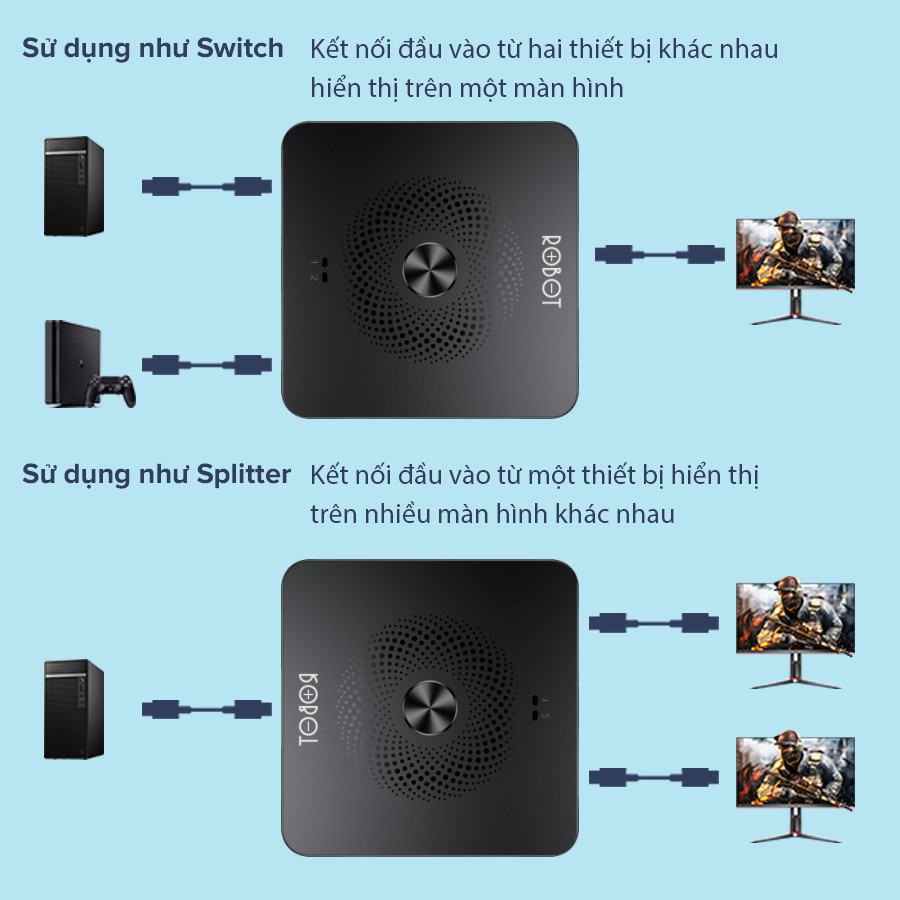 - HUB ROBOT HM103 giúp kết nối máy tính và PS4, kết nối thiết bị chơi game/ đầu thu TV, có thể chuyển đổi linh hoạt trên cùng 1 màn hình thông qua 1 nút chuyển đổi.