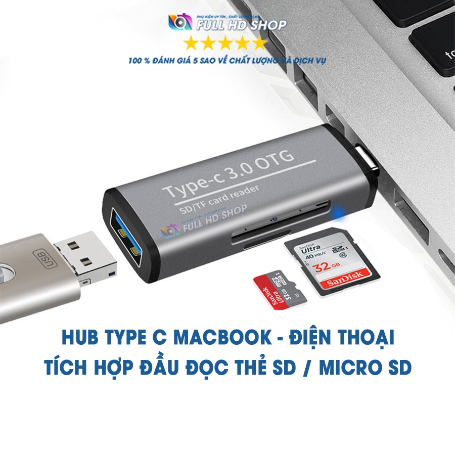 Hub chuyển đổi Type C ra USB 3.0 tích hợp đầu đọc thẻ SD / Micro SD - Bảo hành 1 đổi 1 - Full HD ShopCổng chuyển đổi macbook có thể làm cổng chia usb , đầu đọc thẻ nhớ SD / Micro SD cho các thiết bị kết nối bằng cổng type c.