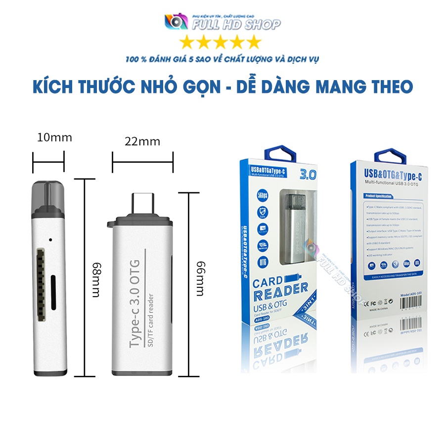 Giới thiệu Hub Chuyển Đổi Type C sang USB 3.0 Tích hợp Đầu đọc thẻ SD/Micro SD chân Type C - Full HD Shop Mã HD09