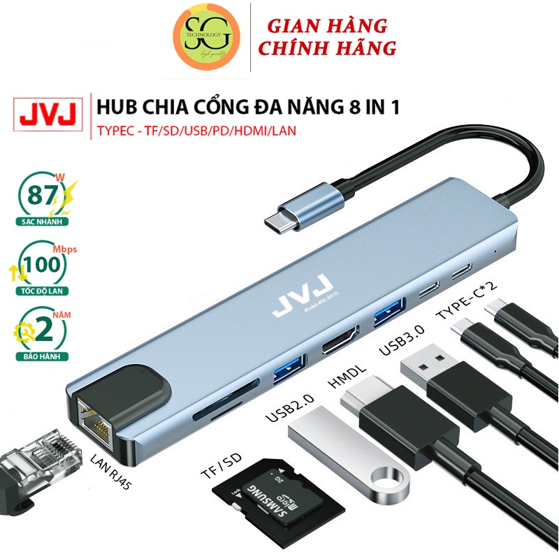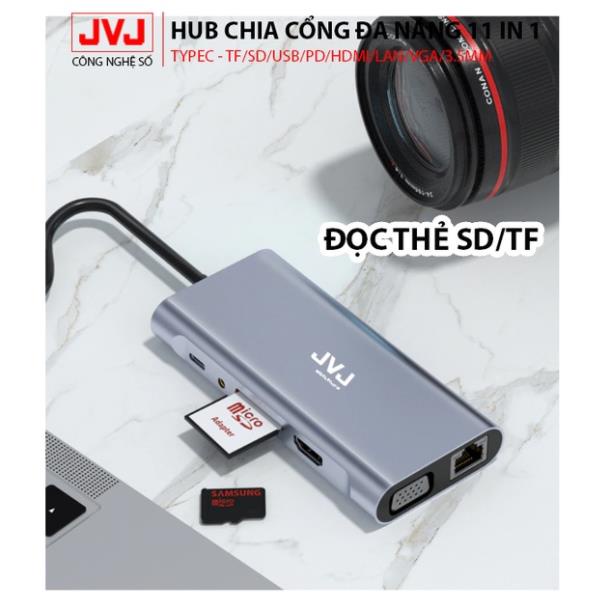 Hub chuyển đổi Macbook JVJ C11 cổng TypeC 11in1 sáng HDMI 4K, VGA, USB - C 3.0, cổng lan RJ45, TypeC 3.5mm BH 2 năm1đổi1