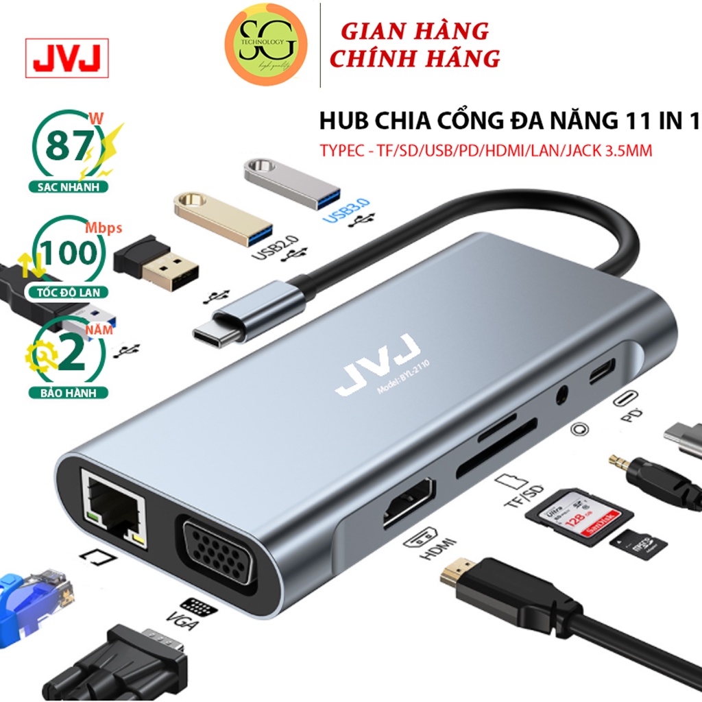Máy tính & Laptop > Thiết Bị Lưu Trữ > USB & OTG || Hub chuyển đổi Macbook JVJ C11 cổng TypeC 11in1 sáng HDMI 4K, VGA, USB - C 3.0, cổng lan RJ45, TypeC 3.5mm BH 2 năm1đổi1Còn hàng