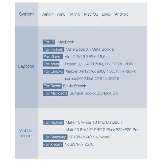 - Tương thích hầu hết các thiết bị từ Smartphone / Tablet / Laptop/ Macbook như : Macbook Pro 2016/2017/2018 , Dell XPS, Huawei Matebook , Xiaomi Mi Air, Samsung S8/S9/S10/N7/8/9,...