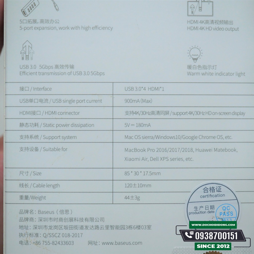 Hub Chuyển Đổi TypeC Sang HDMI 4 USB 3.0 BaseusThông số kĩ thuật: