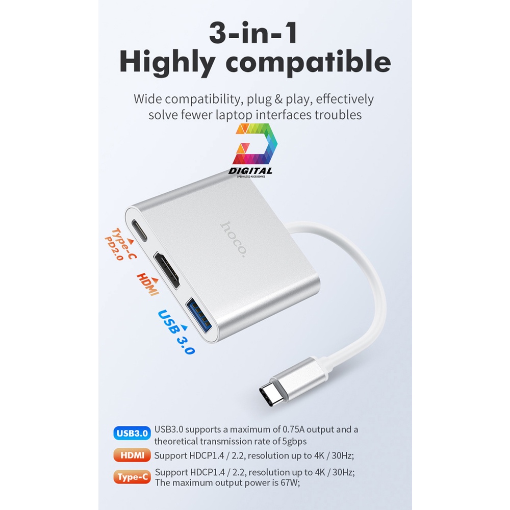 Hub Chuyển Type C Ra USB 3.0 , HDMI & PD 2.0 Hoco HB14 Chính HãngHub Chuyển Type C Ra USB 3.0 , HDMI & PD 2.0 Hoco HB14 một lựa chọn tuyệt vời dành cho các tín đồ công nghệ, giúp hỗ trợ mở rộng các cổng kết nối khác nhau từ chính giao diện Type C trên thiết bị của mình. Đặc biệt, đối với những chiếc Ultrabook hay Macbook bị giới hạn về cổng kết nối thì đây chắn hẳn sẽ là món phụ kiện rất đáng để đầu tư sở hữu.