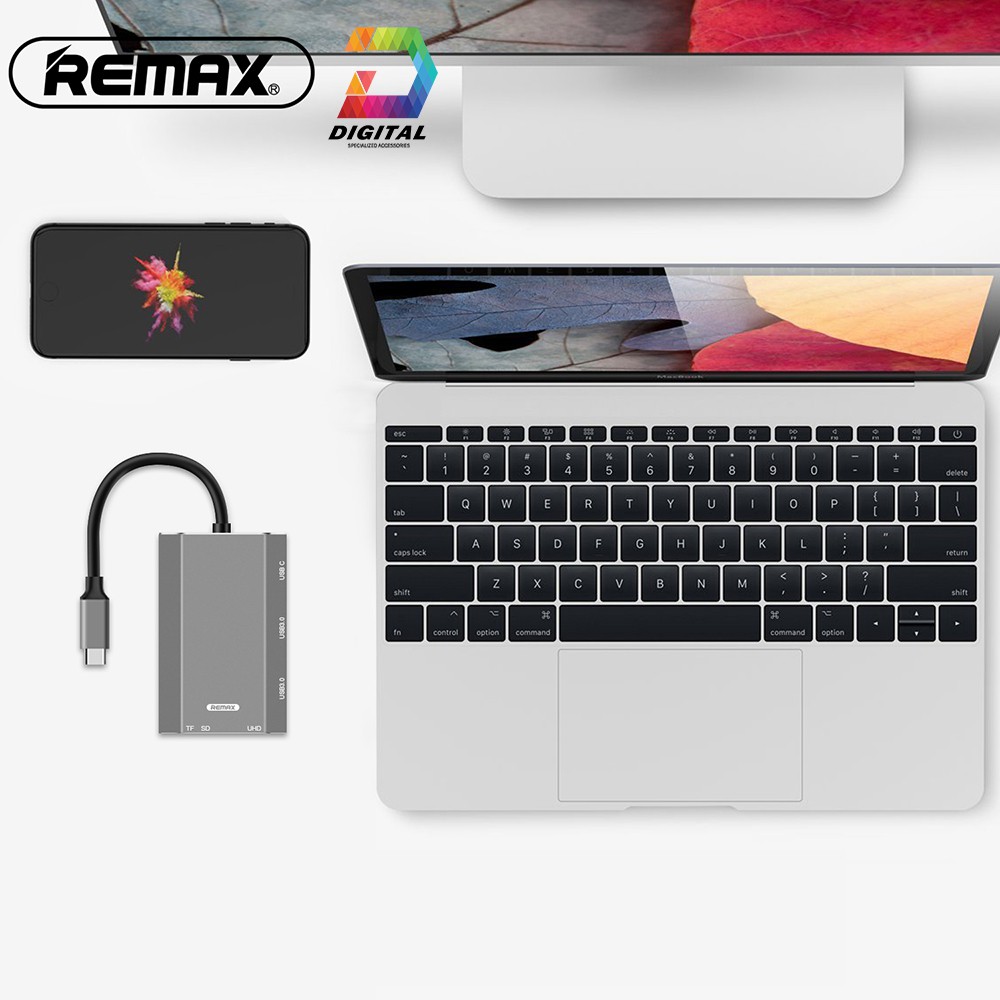 HUB Chuyển TypeC Ra USB 3.0, HDMI, USB C, Thẻ Nhớ Chính Hãng Remax Tốc Độ Cao- Bạn thường gặp khó khăn trong việc chuyển đổi giữa các thiết bị với các đầu cổng khác nhau, từ 1 sợi cáp cổng Type C có thể giúp bạn kết nối với nhiều loại cổng như USB, Type-C, SD/TF (đầu cắm thẻ nhớ) và cả Micro SD.