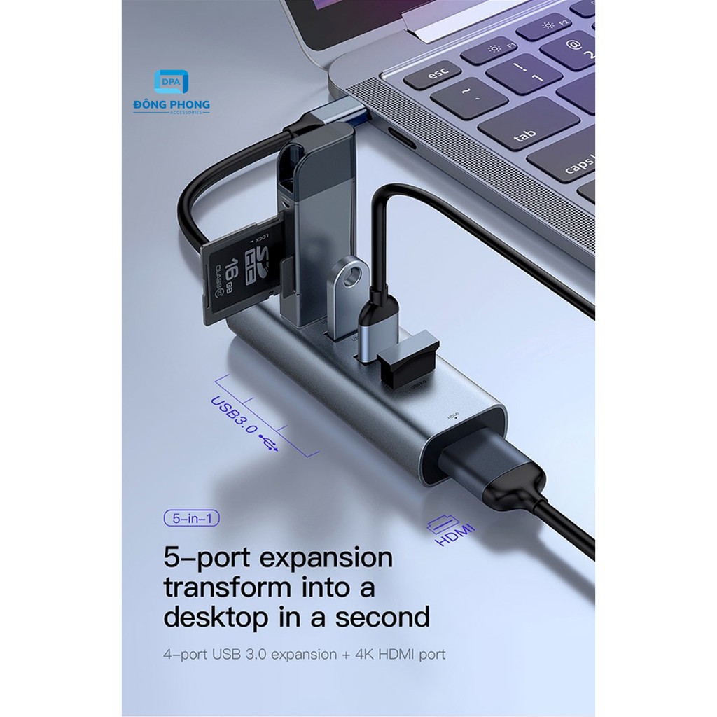 - Bộ Hub chuyển đổi 5 trong 1 Baseus Enjoy Series Type C to USB 3.0 + HDMI có thiết kế đẹp , nhỏ gọn, sang trọng . Bề mặt bằng kim loại màu xám bạc được sơn tỉnh điện cao cấp chống bám vân tay . Thiết kế tinh tế, sang trọng và đẳng cấp.