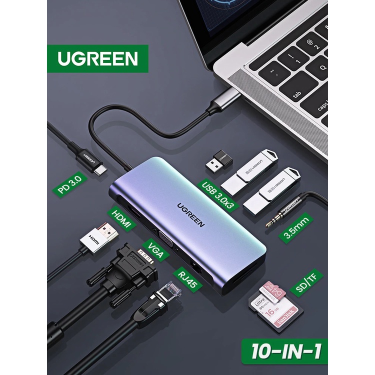 Máy tính & Laptop > Phụ Kiện Máy Tính > Bộ chia cổng USB & Đọc thẻ nhớ || Hub Chuyển USB Type C 10 in1 Cao Cấp Ugreen 80133 Chính Hảng CM179Còn hàng