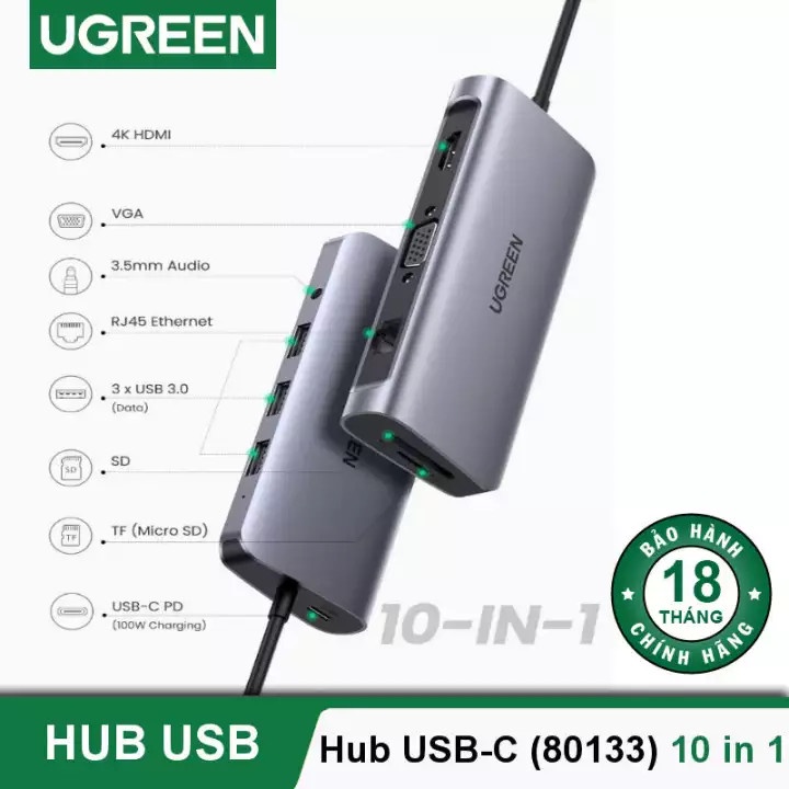 Cáp chuyển đa năng USB-C 10 in 1 cao cấp Ugreen 80133 được sản xuất bởi thương hiệu quốc tế Ugreen với thiết kế nhỏ gọn tinh tế, chất liệu cao cấp bao gồm vỏ nhôm sang trọng, lõi cáp bằng đồng nguyên chất và các chipset xử lý cao cấp, mang đến độ bền vượt trội và khả năng kết nối tối ưu nhất. Ngoài ra, nhà sản xuất còn trang bị thêm cổng USB-C giúp kết nối sạc cho máy tính, laptop của bạn ngay khi đang xử dụng thiết bị này.