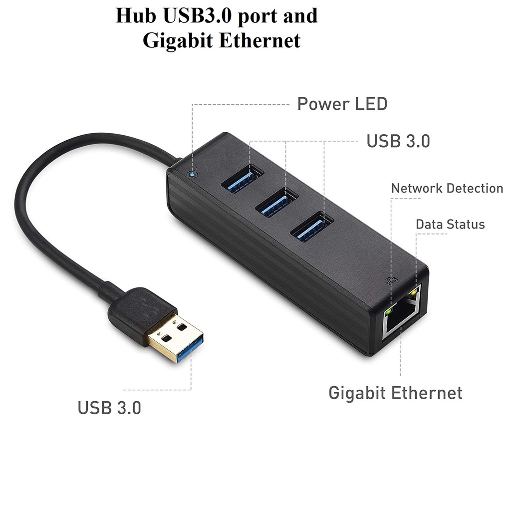 - Chỉ cần 1 cổng USB3.0 duy nhất có thể ngay lập tức tạo ra 3 cổng USB 3.0 với tốc độ ngang với tốc độ cổng USB3.0 có sẵn ở máy và một cổng Lan với tốc độ Gigabit (10/100/1000)