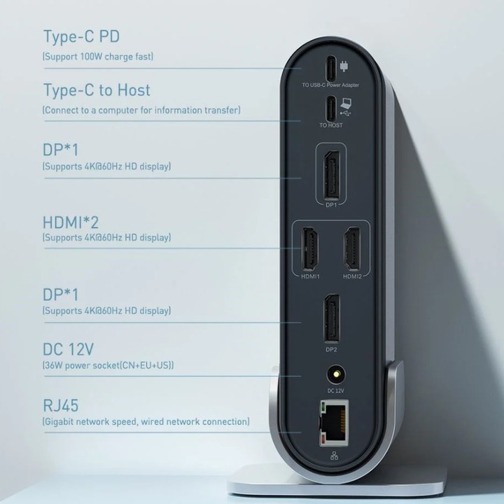 - Giao diện: Loại-CPD (đầu vào) + Loại-C (đầu ra) + USB2.0 * 2 + VGA * 1 + 4K HD * 1 + - Bộ nguồn DC * 1 + RJ45 * 1 + SD + TF * 1 + USB 3.0 * 3+
