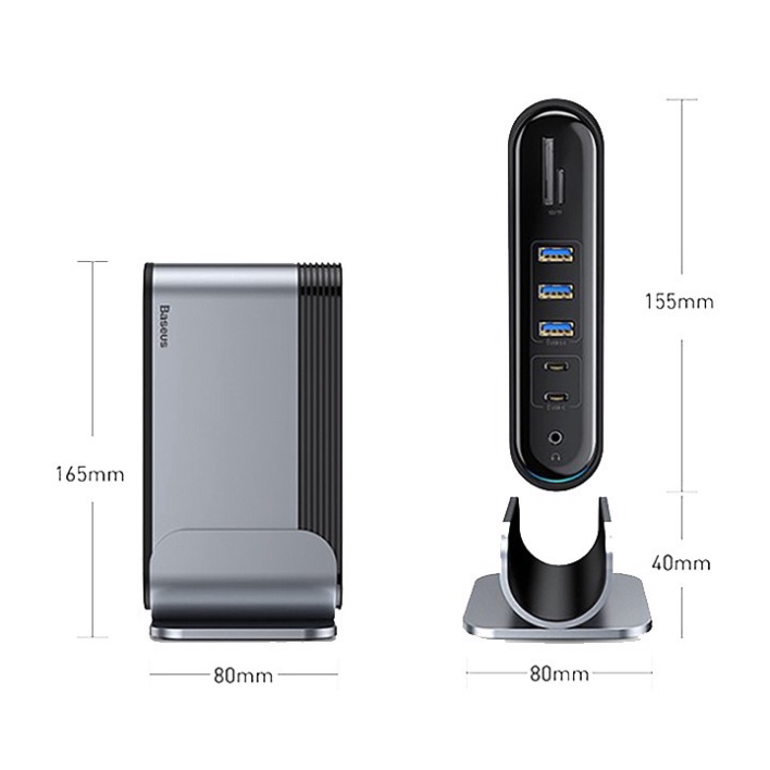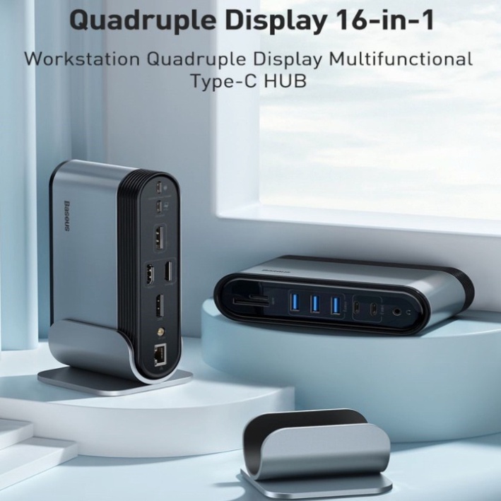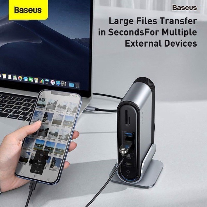 - Với Hub chuyển đa năng Baseus Working Station 16 in 1 Multifunctional bạn có thể dễ dàng xuất hình ảnh, âm thanh độ nét cao qua cổng HDMI/ VGA/ AUX 3.5mm, đồng bộ và chia sẽ dữ liệu/ hình ảnh từ thẻ nhớ, các thiết bị lưu trữ. Ngoài ra bộ HUB còn được trang bị cổng mạng LAN có dây (RJ-45) cho phép bạn có thể kết nối mạng ở những nơi không có Wifi . Bạn sẽ không còn phải gặp các phiền phức và bất tiện do thiếu cổng kết nối.