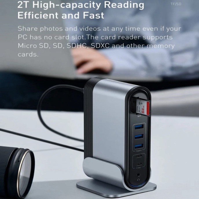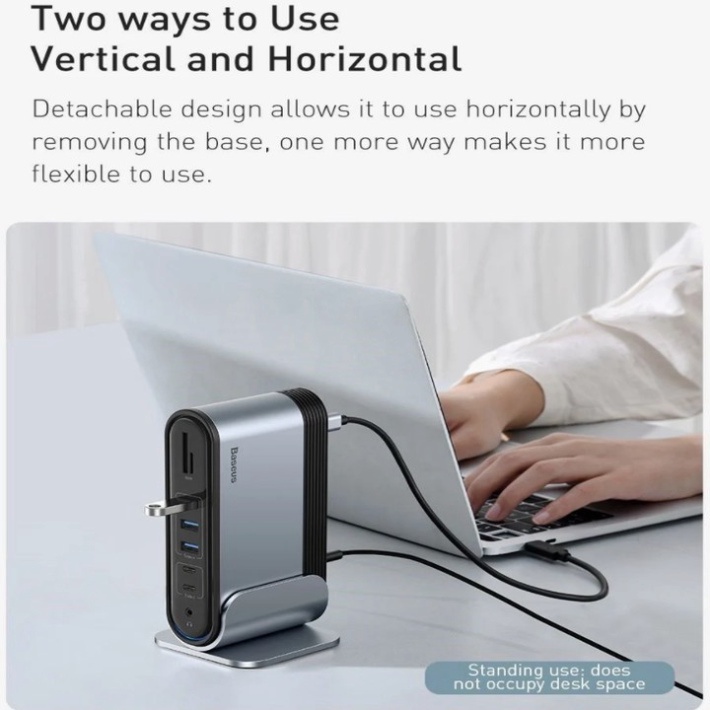 - Với Hub chuyển đa năng Baseus Working Station 16 in 1 Multifunctional bạn có thể dễ dàng xuất hình ảnh, âm thanh độ nét cao qua cổng HDMI/ VGA/ AUX 3.5mm, đồng bộ và chia sẽ dữ liệu/ hình ảnh từ thẻ nhớ, các thiết bị lưu trữ. Ngoài ra bộ HUB còn được trang bị cổng mạng LAN có dây (RJ-45) cho phép bạn có thể kết nối mạng ở những nơi không có Wifi . Bạn sẽ không còn phải gặp các phiền phức và bất tiện do thiếu cổng kết nối.