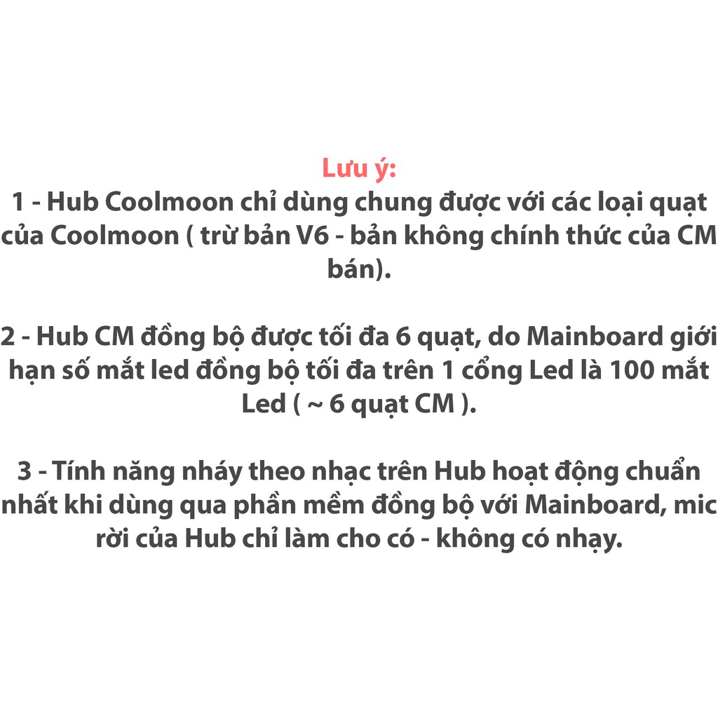 Lưu ý:1 - Hub Coolmoon chỉ dùng chung được với các loại quạt của Coolmoon 6 pin.