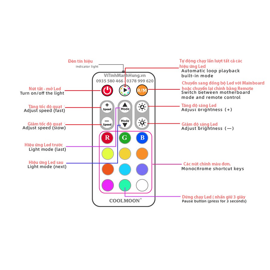4 - Nhấn nút R/M trên Remote để chuyển sang Sync - đồng bộ Led với Mainboard, để chuyển lại dùng bằng Remote thì nhấn lại nút R/M 1 lần.