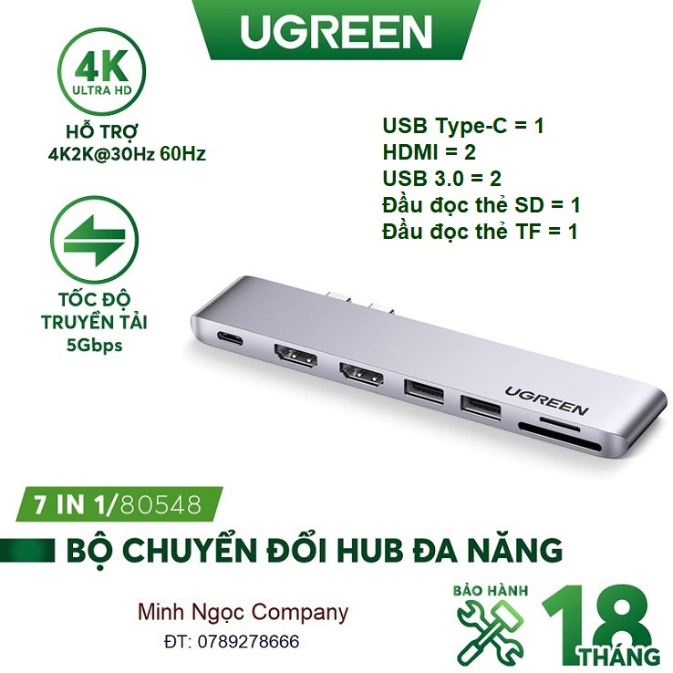 Hub đa năng 7 in 1 từ USB Type C sang 2 cổng HDMI, 2 cổng USB 3.0, đầu đọc thẻ SD/TF, 1 cổng USB Type-C Ugreen 80548Thông tin sản phẩm