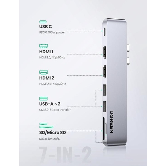 Giới thiệu Hub đa năng 7 in 1 từ USB Type C sang 2 cổng HDMI, 2 cổng USB 3.0, đầu đọc thẻ SD/TF, 1 cổng USB Type-C Ugreen 80548