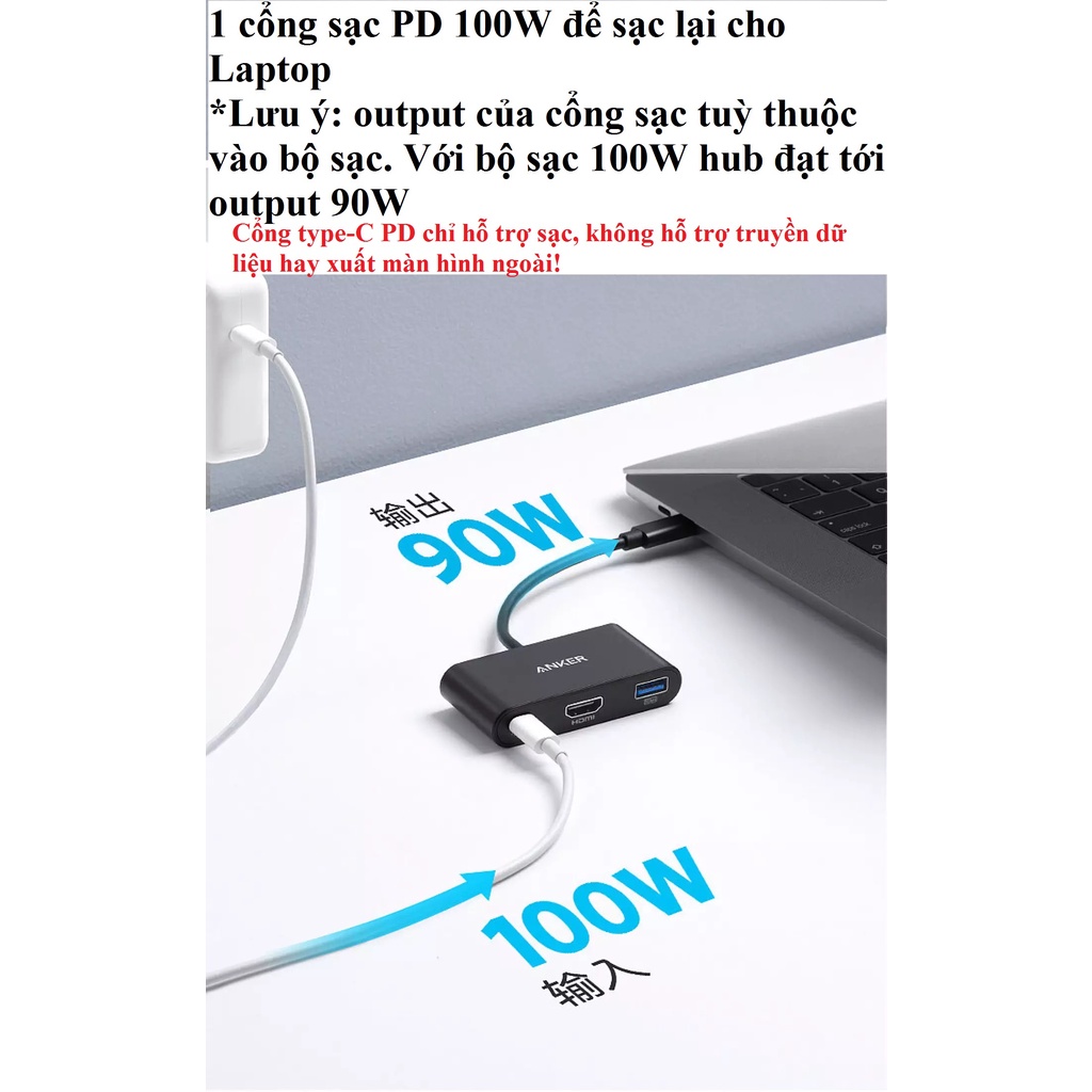 (Chỉ hỗ trợ sạc, không hỗ trợ truyền dữ liệu hay xuất hình. Output sạc tuỳ thuộc vào bộ sạc. Với bộ sạc 100W, hub đạt output 90W)