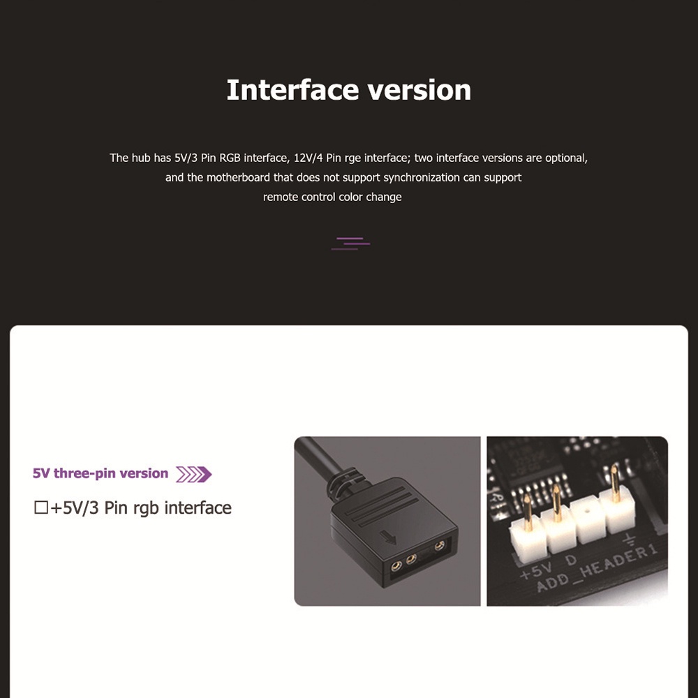 - Bộ Hub có 8 cổng 4 pin RGB để lắp quạt và 8 cổng 3 pin ARGB. Sử dụng nguồn điện thông qua cổng SATA. Trong 8 cổng kết nối có 1 cổng được đánh dầu màu đỏ, dành cho việc cắm nhiều quạt qua các đầu nối tiếp.