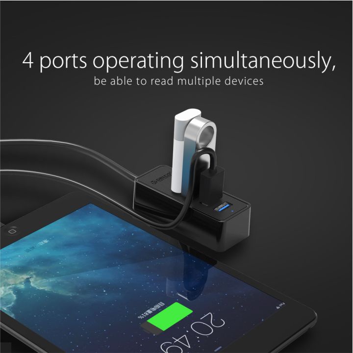 - 4 cổng đầu ra tiện lợi : Hub USB 3.0 Orico W5P-U3 4 cổng được thiết kế với khả năng đáp ứng dòng điện cho cả 4 thiết bị cùng 1 lúc, đáp ứng tốc độ không bị thay đổi quá nhiều và khả năng bảo vệ khi dòng điện quá tải và bảo vệ ngắn mạch để giữ cho nó khỏi quá áp, quá dòng, rò rỉ.