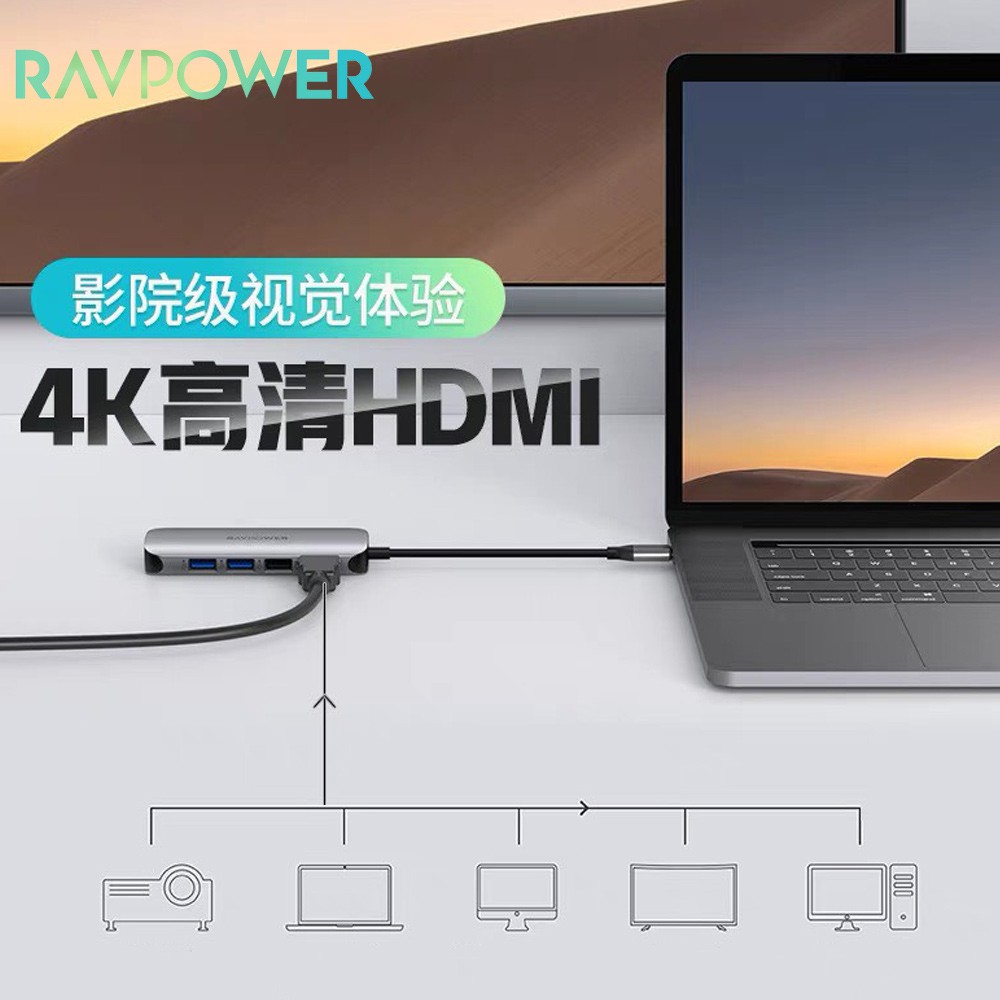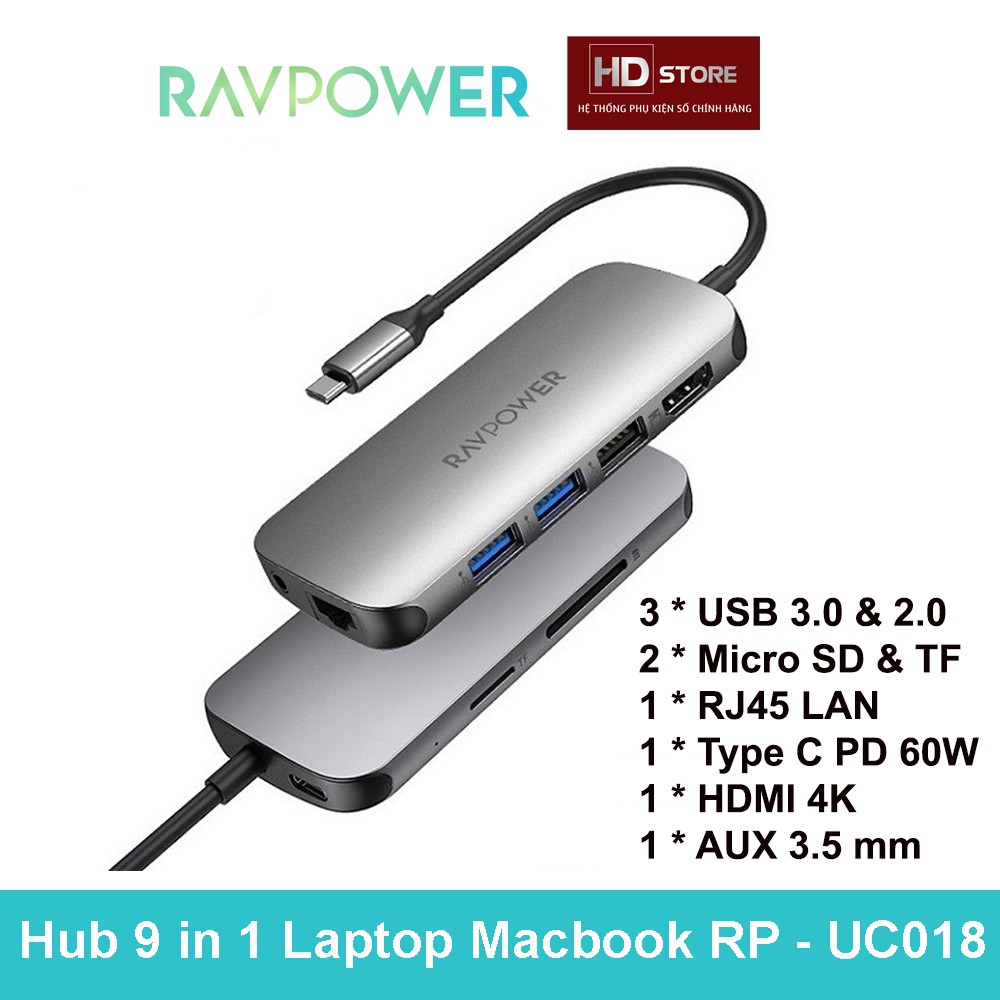 Máy tính & Laptop > Phụ Kiện Máy Tính > Bộ chia cổng USB & Đọc thẻ nhớ || Hub RAVPower Type C 9 in 1 cho Laptop Macbook Air Pro Mac (Type-C to HDMI/ USB3.0/ LAN / PD 60W) Đầu chuyển đổiCòn hàng