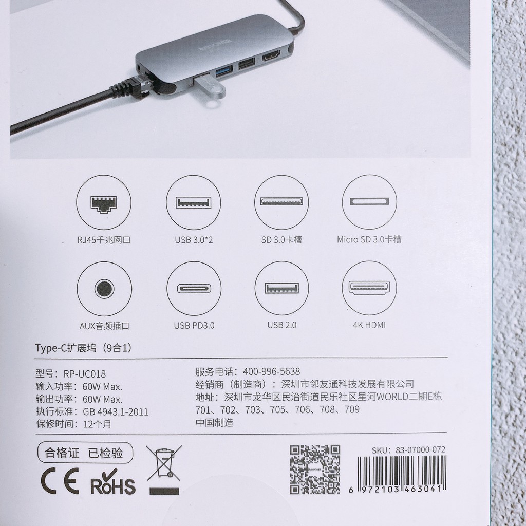 Hub chuyển RAVPower Type-C Usb C 9 in 1 cho Laptop Macbook Air Pro (Type-C to HDMI/ USB3.0/ LAN / PD 60W)Mã Sản phẩm : RP-UC018