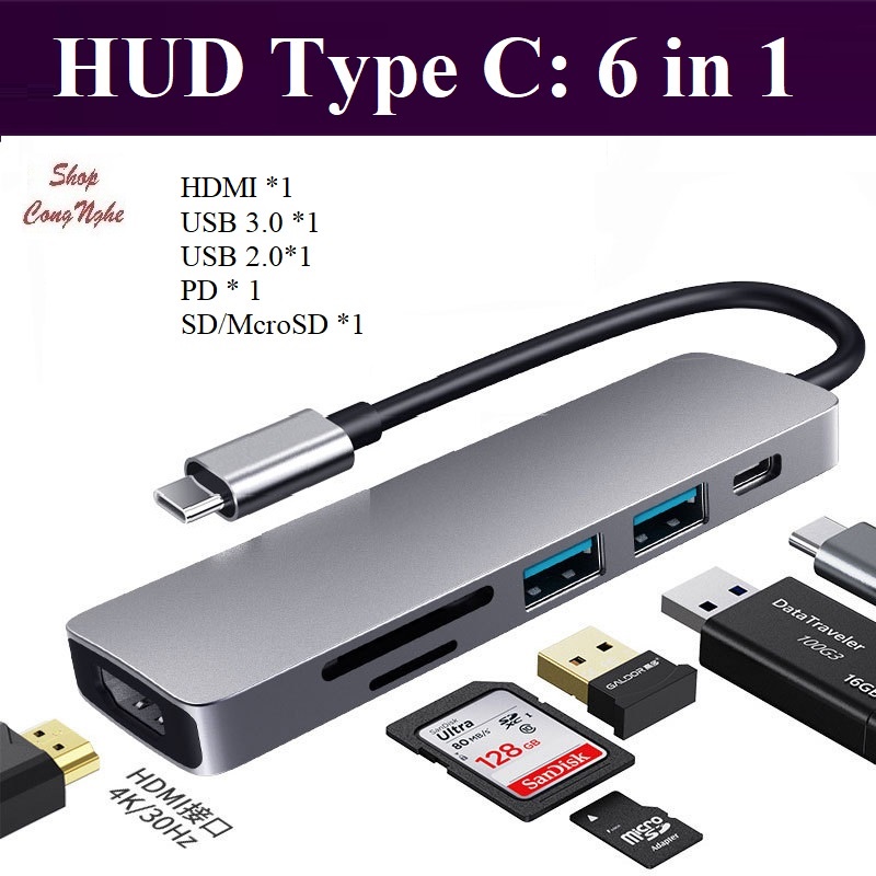 Hub Type C 6in1 - Cổng chuyển đổi HUB USB Type-C to HDMI, USB 3.0, SD, TF, PD cho Laptop Macbook