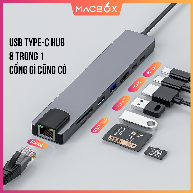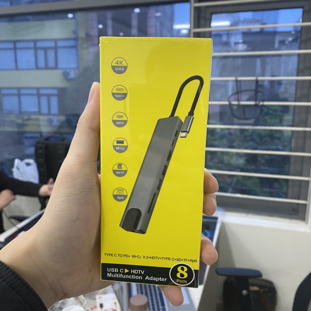 Máy tính & Laptop > Phụ Kiện Máy Tính > Bộ chia cổng USB & Đọc thẻ nhớ || Hub Type C 8in1 - Cổng chuyển đổi HUB USB Type-C to HDMI, USB 3.0, SD, TF, RJ45, PD Type-C cho Laptop MacbookCòn hàng