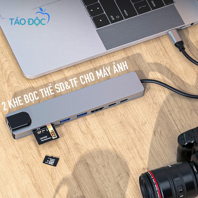 Hub Type C 8in1 - Cổng Chuyển Đổi HDMI, USB 3.0, SD, TF, RJ45, PD Type-C Cho Laptop Macbook