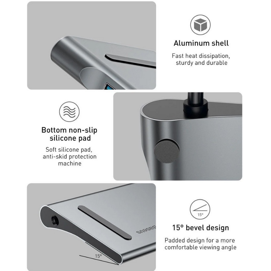 - Thiết kế dạng dock tiện dụng, bề mặt bằng nhôm tinh chế với tông màu xám sang trong và đẳng cấp tạo sự đồng bộ với thiết kế của Macbook.