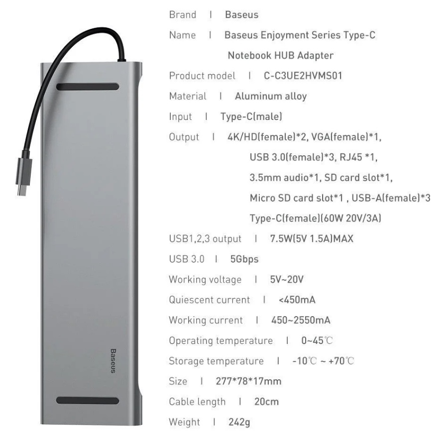 - Bộ Hub đa năng Baseus Enjoyment Series Type C chuyển đổi các cổng Thunderbolt trên Macbook Pro 2016/2017/2018 hay cổng USB Type C trên các smartphone/ Tablet/ Laptop Android/Windows . Bội HUB chuyển đổi có ngỏ vao là cổng USB Type C và ngỏ ra là hầu hết các chuẩn giao tiếp phổ thông hiện nay như : USB 2.0/ USB 3.0 / HDMI/ VGA/ USB 3.0/ Card Reader/ RJ-45/AUX 3.5mm ...