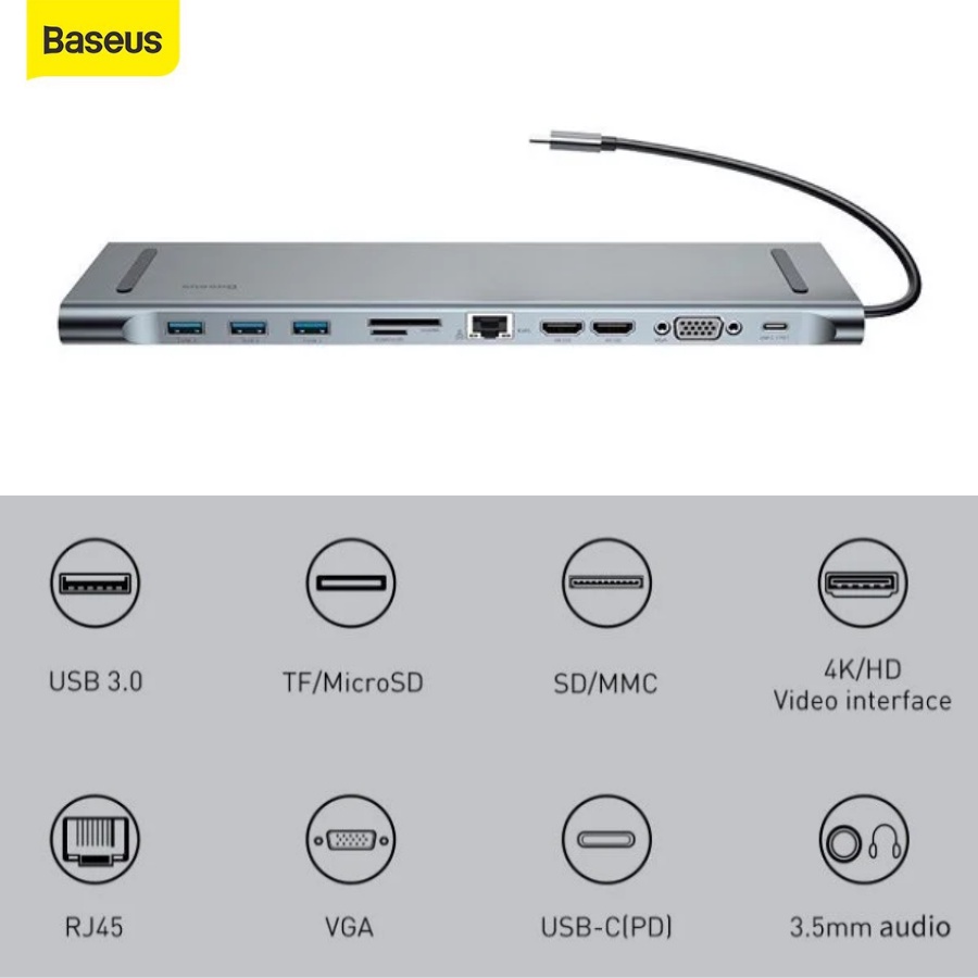 Máy tính & Laptop > Phụ Kiện Máy Tính > Bộ chia cổng USB & Đọc thẻ nhớ || Hub Type C Baseus 11 in 1 cho Macbook Laptop, Cổng chuyển đổi Type C sang HDMI 4K Usb 3.0 VGA Card Reader RJ45 AUX 3.5mmCòn hàng