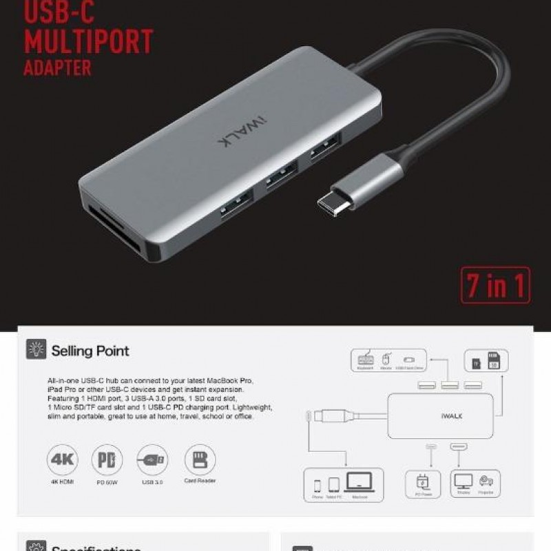 Giới thiệu Hub Type-C iWALK 7 in 1, 4K USB-C ra HDMI, cổng sạc PD 60W, 3xUSB3.0 5Gbps