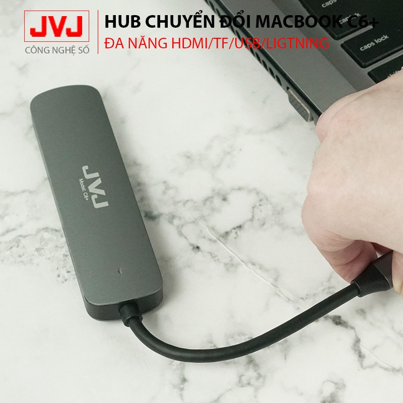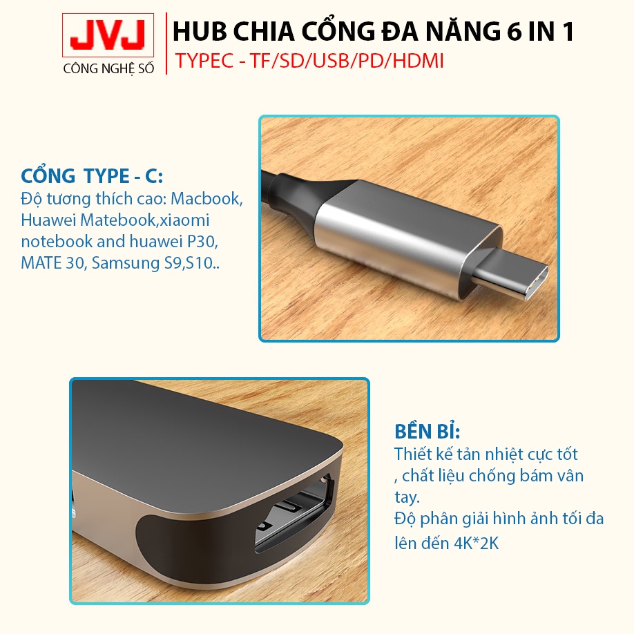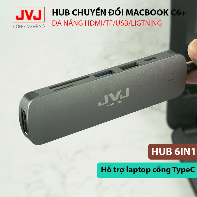 Hub USB typec JVJ C6 Plus 6 trong 1 cổng chuyển đổi chia cổng Type-C sang USB 3.0 SD, USB 2.0, Type C, TF, 4K HDMI cho MacBook laptop - Bảo hành 2 năm chính hãngLƯU Ý: Bởi vì vật liệu hợp kim Al tản nhiệt và có nhiều chức năng nên sản phẩm có thể sẽ ấm hơn một chút khi sử dụng, đó là hiện tượng bình thường và không ảnh hưởng đến thiết bị