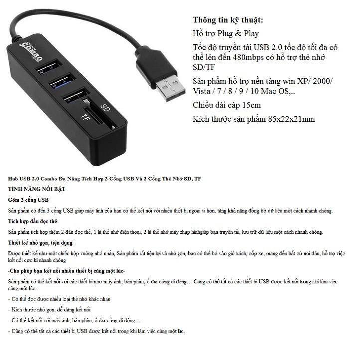 Hub USB 2.0 Combo Đa Năng Tích Hợp 3 Cổng USB Và 2 Cổng Thẻ Nhớ SD, TFTÍNH NĂNG NỔI BẬT