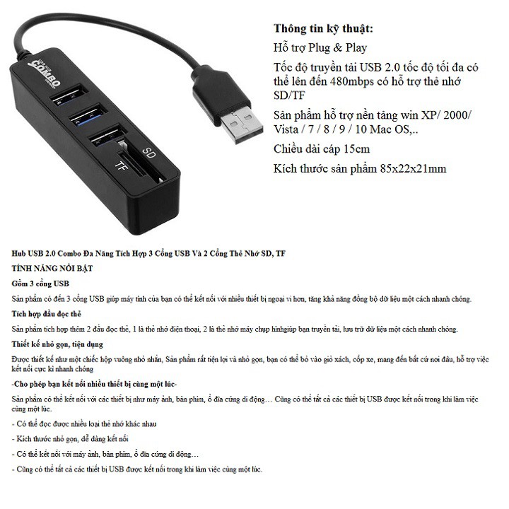 Máy tính & Laptop > Phụ Kiện Máy Tính > Bộ chia cổng USB & Đọc thẻ nhớ || Bộ Hub USB 2.0 Combo Đa Năng Tích Hợp 3 Cổng USB Và 2 Cổng Thẻ Nhớ SD, TFCòn hàng