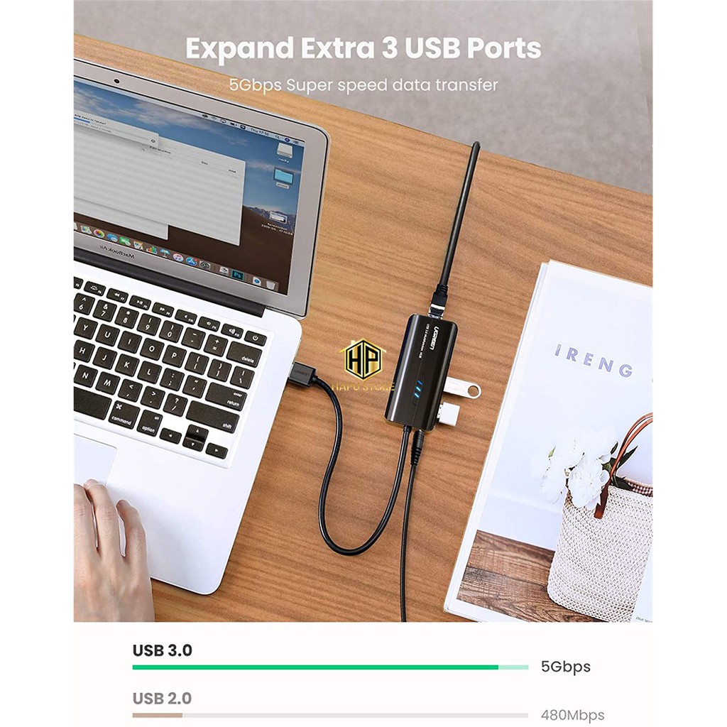 Giới thiệu HUB USB 3 cổng 3.0 Ugreen 20265 kèm cổng LAN 10/100/1000 Mbps tốc độ cao - Hapustore