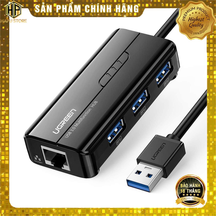 HUB USB 3 cổng 3.0 Ugreen 20265 kèm cổng LAN 10/100/1000 Mbps tốc độ cao - Hapustore