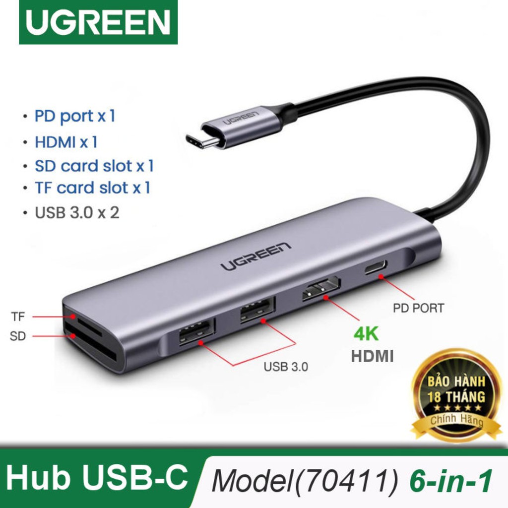 Hub USB-C 6 in 1 Ugreen 70411 (ra HDMI, 2USB 3.0 + SD/TF + PD100W) - Hàng chính hãng