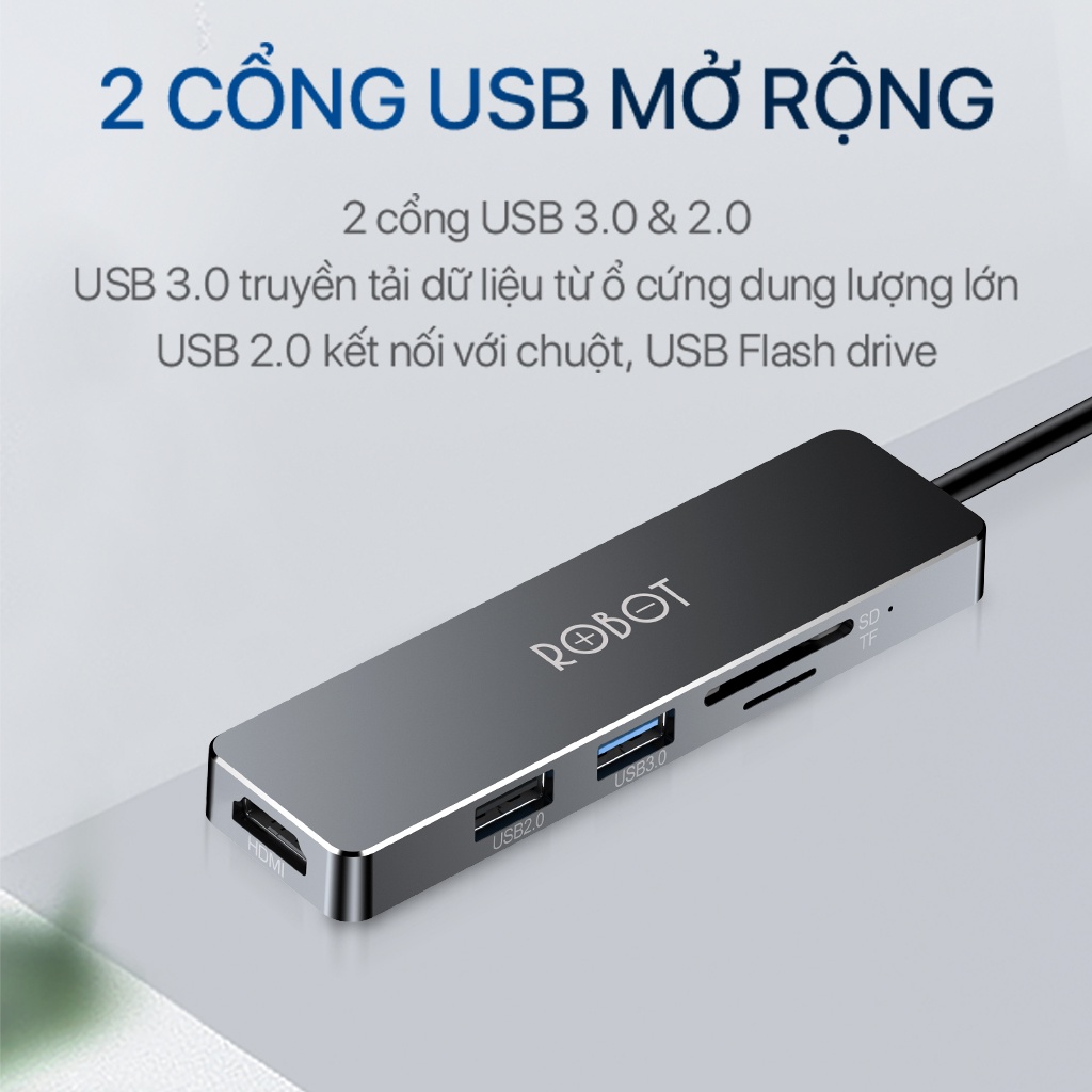 HUB CHUYỂN ĐỔI ĐA NĂNG 5 TRONG 1 ROBOT HT240S TỪ CỔNG TYPE-C SANG CỔNG USB 3.0/ HDMI/ SD/ MICRO SD - BẢO HÀNH 12 THÁNGSản phẩm chính hãng ROBOT
