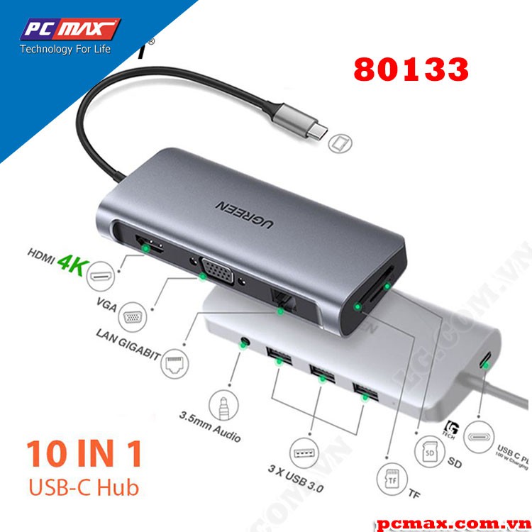Hub USB Type C 10 in 1 4K USB C to HDMI, VGA, USB 3.0 Ugreen 80133 - Hàng chính hãng