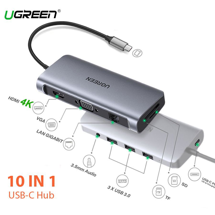 Hub USB Type C 10 in 1 4K USB C to HDMI, VGA, USB 3.0 Ugreen 80133 - Hàng chính hãngMở rộng Hub USB C 10 trong 1: Đế cắm USB-C 10 trong 1 của UGREEN có Gigabit Ethernet, cổng sạc PD loại C, cổng 4K HDMI, 3 cổng USB 3.0, đầu đọc thẻ SD / TF, a Giắc cắm âm thanh 3,5 mm và một cổng VGA 1080P. Tất cả các cổng trung tâm có thể được sử dụng đồng thời, cho phép bạn kết nối bàn phím, chuột, trình điều khiển USB, Đĩa ngoài với MacBook Pro
