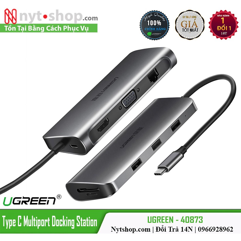 Mô Tả Sản Phẩm- UGreen 40873 sẽ giúp bạn mở rộng cổng Usb Type C ra đồng thời 1 cổng HDMI, 1 cổng Vga, 3 cổng Usb 3.0, 1 cổng Lan (RJ45), 1 đọc thẻ nhớ SD, 1 cổng đọc thẻ nhớ TF và 1 cổng cung cấp năng lượng Type C PD với công suất 100W.