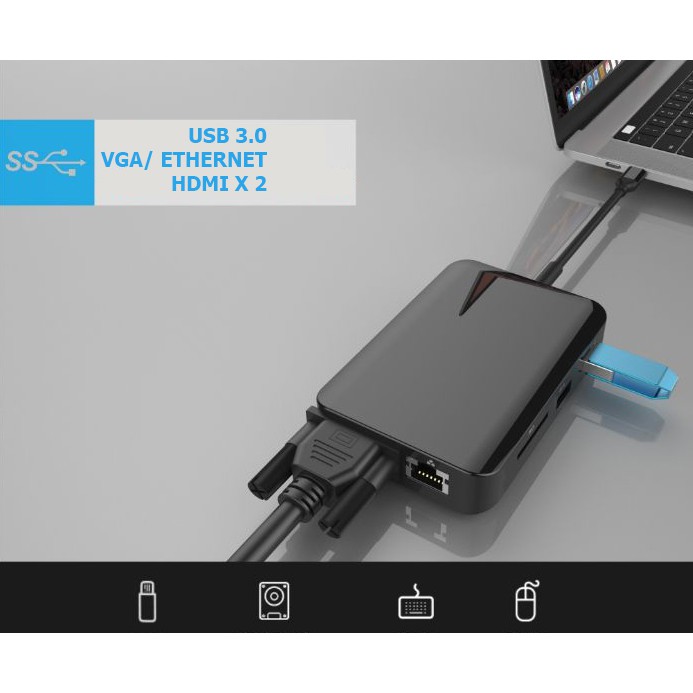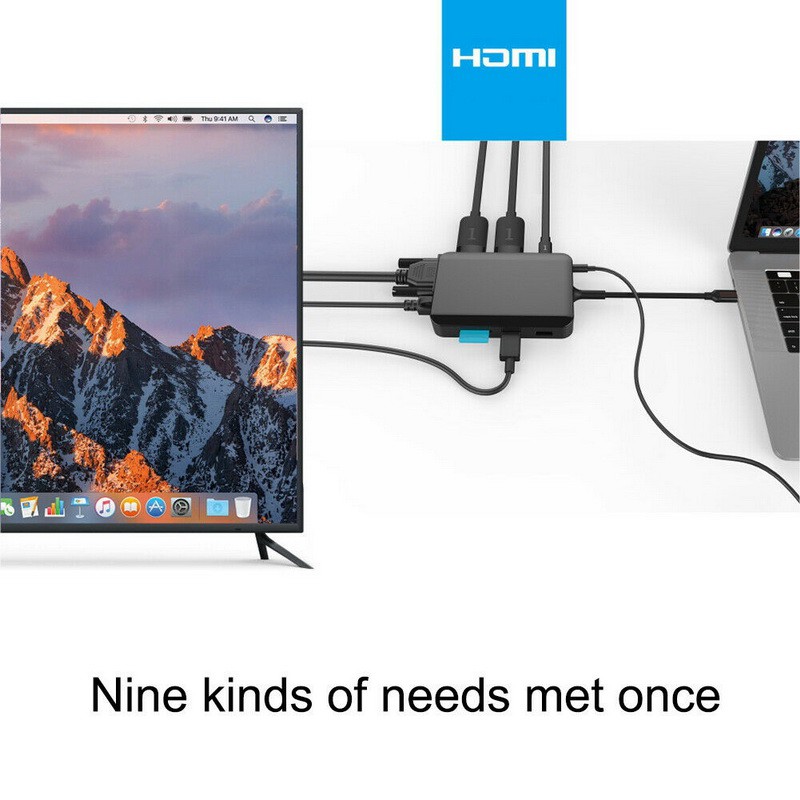 👉Hub chia 9 cổng với các cổng: 2 * HDMI + 2 * USB3.0 + 1 * PD + 1 * RJ45 + 1 * VGA + 1 * Thẻ Nhớ + 1 * Jack Âm Thanh 3.5mm.
