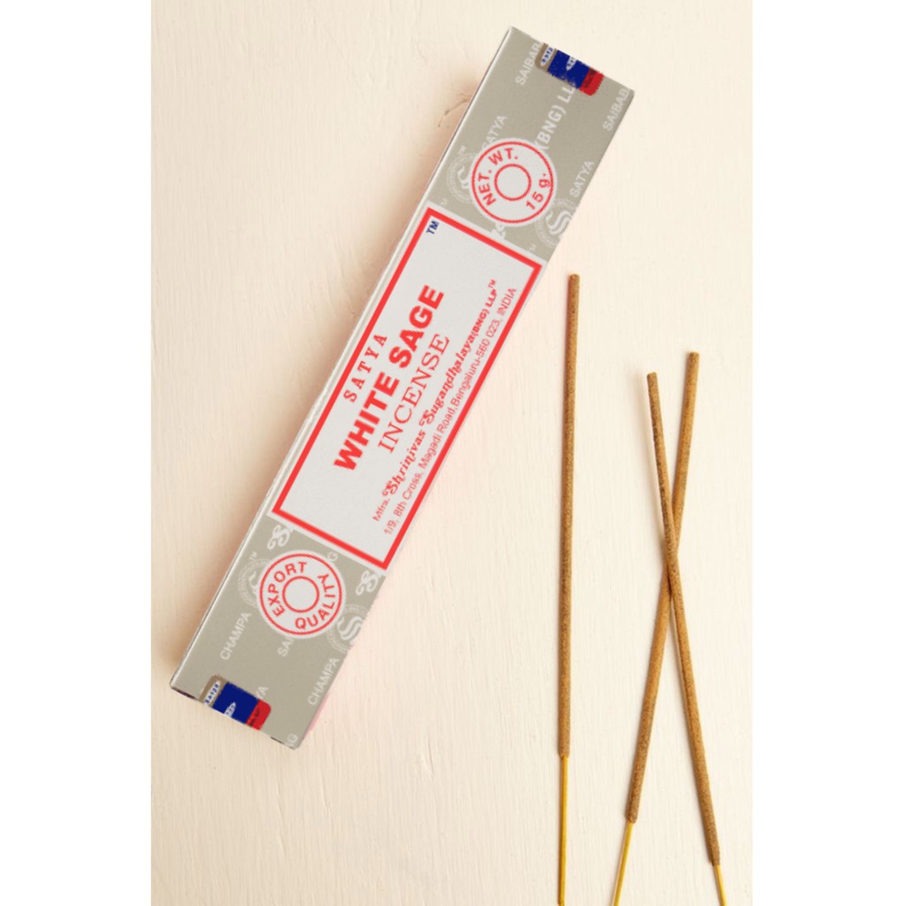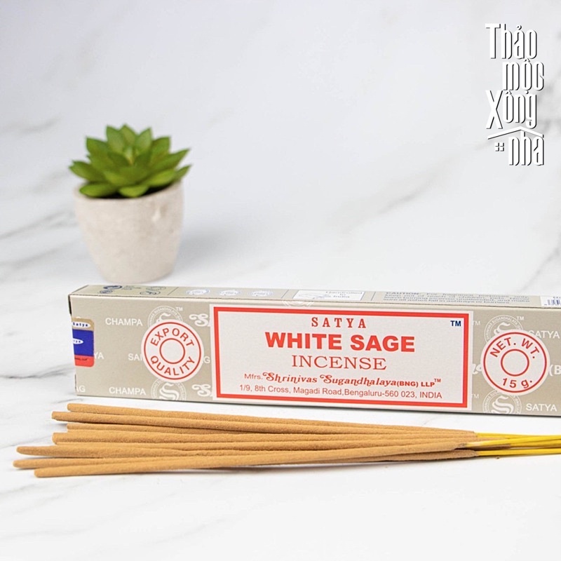 WHITE SAGE Hương xô thơm trắng được biết đến với hương thơm ngọt ngào và đặc tính chữa bệnh. Là biểu tượng của sự sạch sẽ và tinh khiết. Thanh hương sẽ có mùi thơm dịu và ngọt hơn so với xô thơm bó. Đem lại cảm giác hài lòng và sức mạnh thanh tẩy không gian mạnh mẻ.Satya là một hãng làm nhang/ hương thơm thủ công gia đình truyền thống lâu đời ở Ấn và là số 1 trên thế giới về thanh hương liệu. Họ đã nghiên cứu và chế tạo ra công thức pha một số loại gỗ và nhuỵ hoa khác nhau để tạo ra các mùi hương riêng. Tất cả thanh hương liệu của họ đều được làm thủ công hoàn toàn. Bột gỗ được trộn cùng keo làm từ nhựa cây, sau đó vê tay trên một thanh tăm tre mỏng. Hãng hầu hết chỉ sản xuất riêng 1 vài dòng xuất khẩu cho thị trường Mỹ và EU.