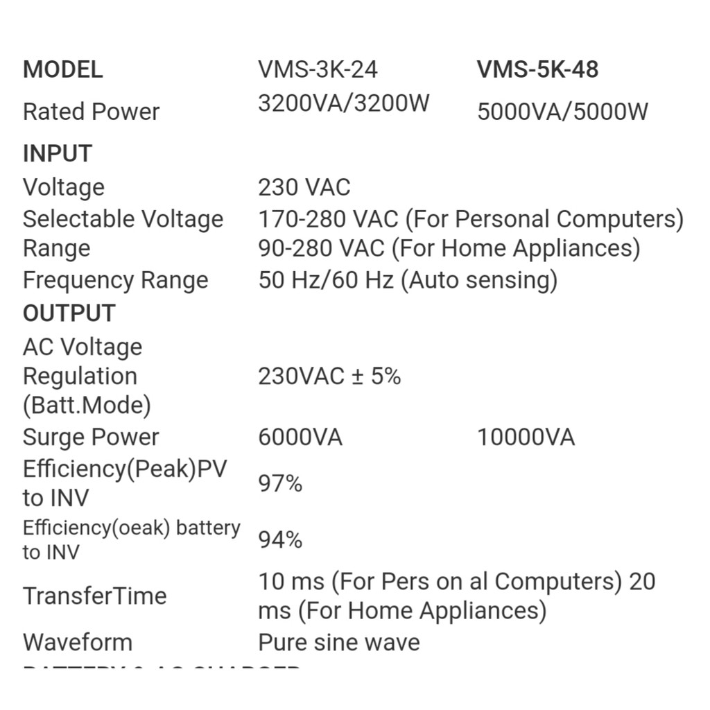 2. Đầu vào PV rộng (120V - 500VDC) MPPT hoạt động từ 120V - 450V, sạc MPPT SCC 80A, sạc AC 80A, chế độ sạc 3 giai đoạn,