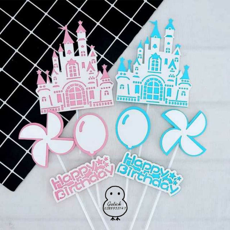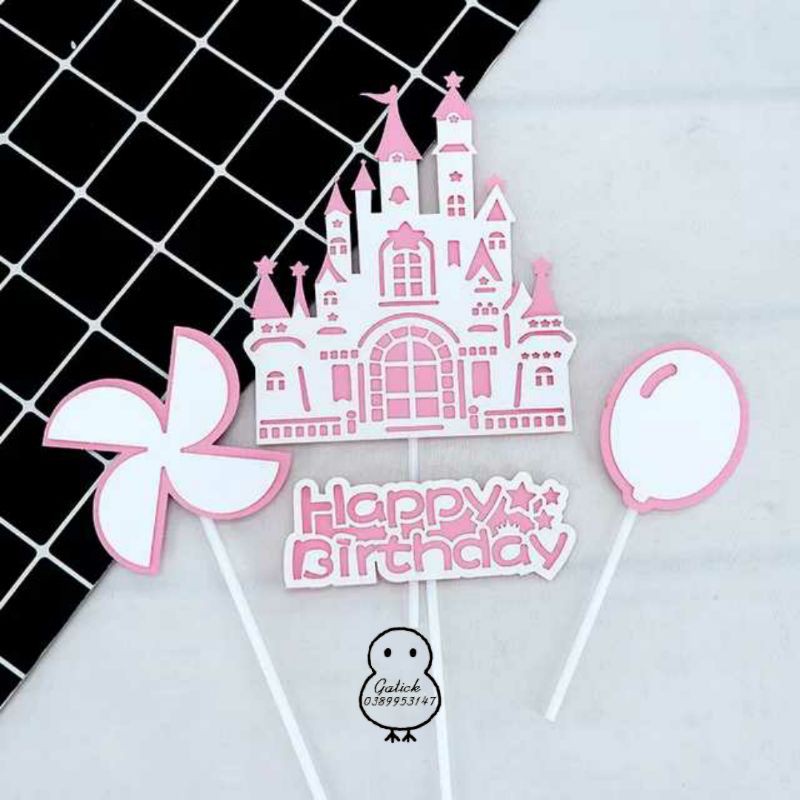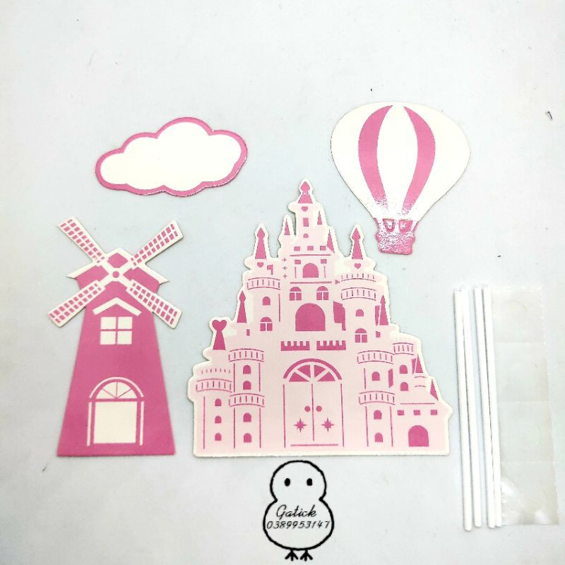 Bộ hình cắm lâu đài giấy hồng trang trí bánh kemBộ sản phẩm gồm:4 chi tiết được in trên chất liệu giấy cứng hình ảnh sắc nét, mẫu mã đẹp